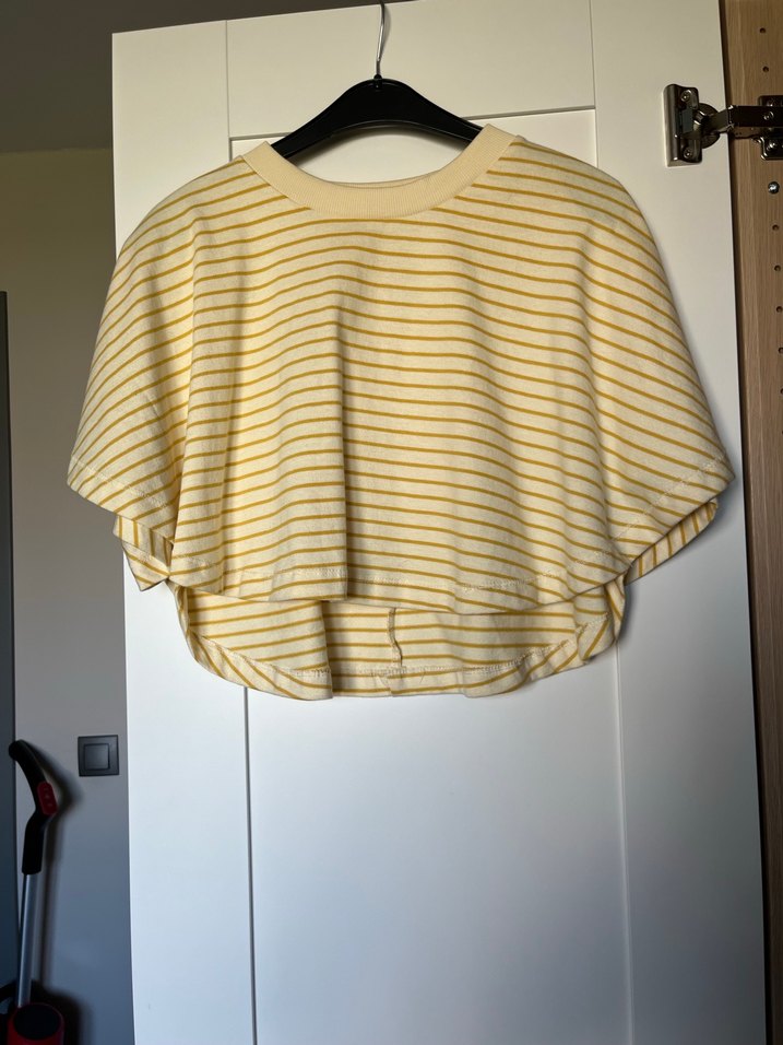 Kısa kollu, yuvarlak yakalı kadın tişörtü. Rahat kesimli, midi boyda, yumuşak. Sarı çizgili ve hafif pile detaylı, günlük sokak stili için uygundur.