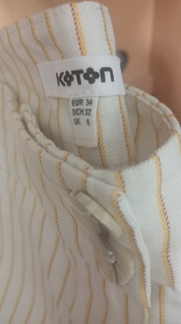 Koton marka sarı çizgili bayan pantolon , İki tane dışında düğmesi var bir tanede şefaf içinden düğmeli ve fermuarlı . 34 beden .Sokak modası ve avangart tarz için uygun. En sonki fotoğrafta rengi tam belli oluyor.Cebi vardır.Arka tarafında iki tane süs cebi vardır.