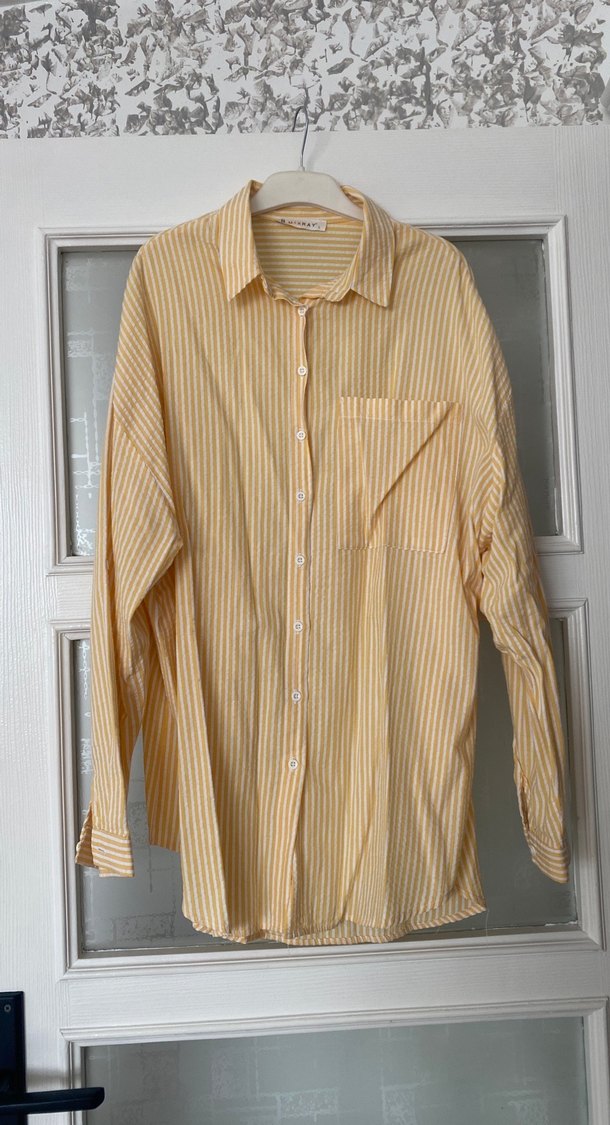 Sarı çizgili, düğmeli, uzun kollu, yakalı, hafif keten kumaştan rahat kesim midi gömlek.