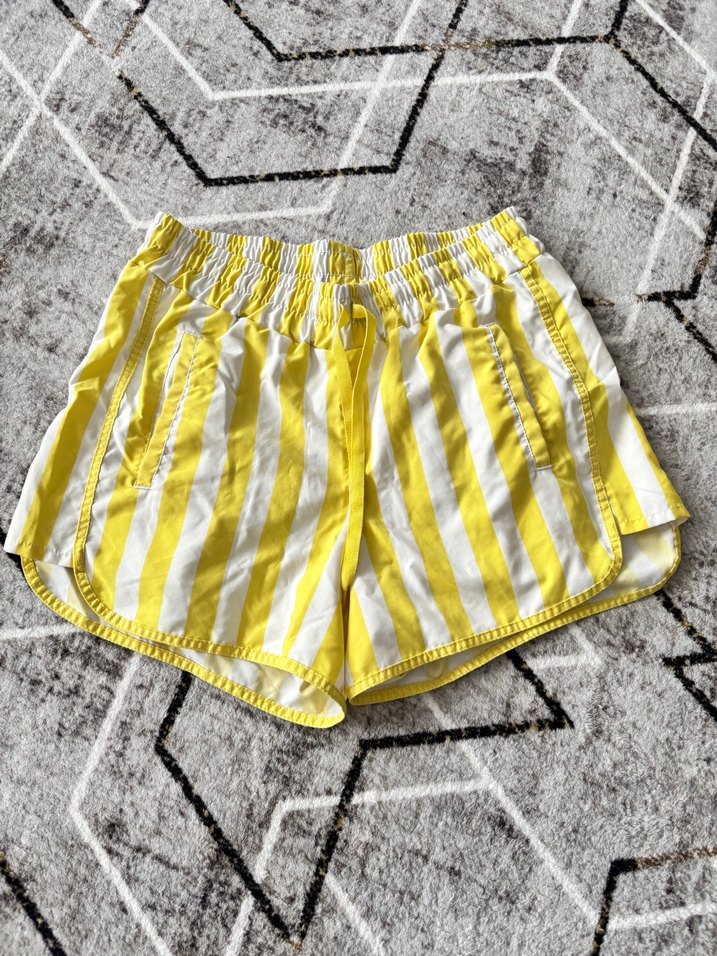 Açık sarı çizgili, mini şort. Yumuşak sentetik kumaştan, rahatlığı sağlayan bol kesim, plajda giymeye uygun