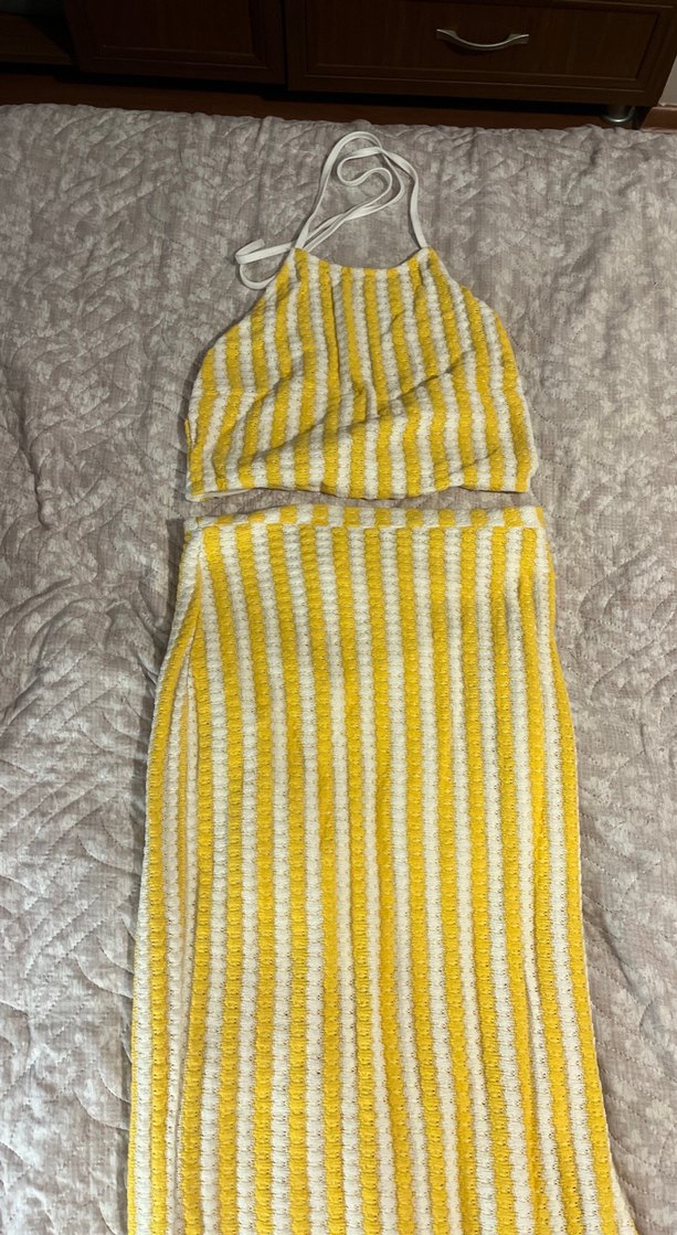 Sarı çizgili boyundan bağlamalı ikili takım. Eteği midi boy ve yandan yırtmaçlı. Hiç giymedim.