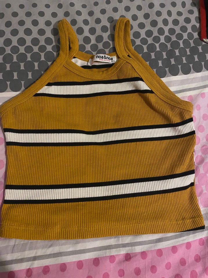 Sarı renkli, siyah ve beyaz yatay çizgili örgü dokulu, straplez yaka ve kolsuz, dar kesim kadın atlet. Günlük sokak stiline uygun.