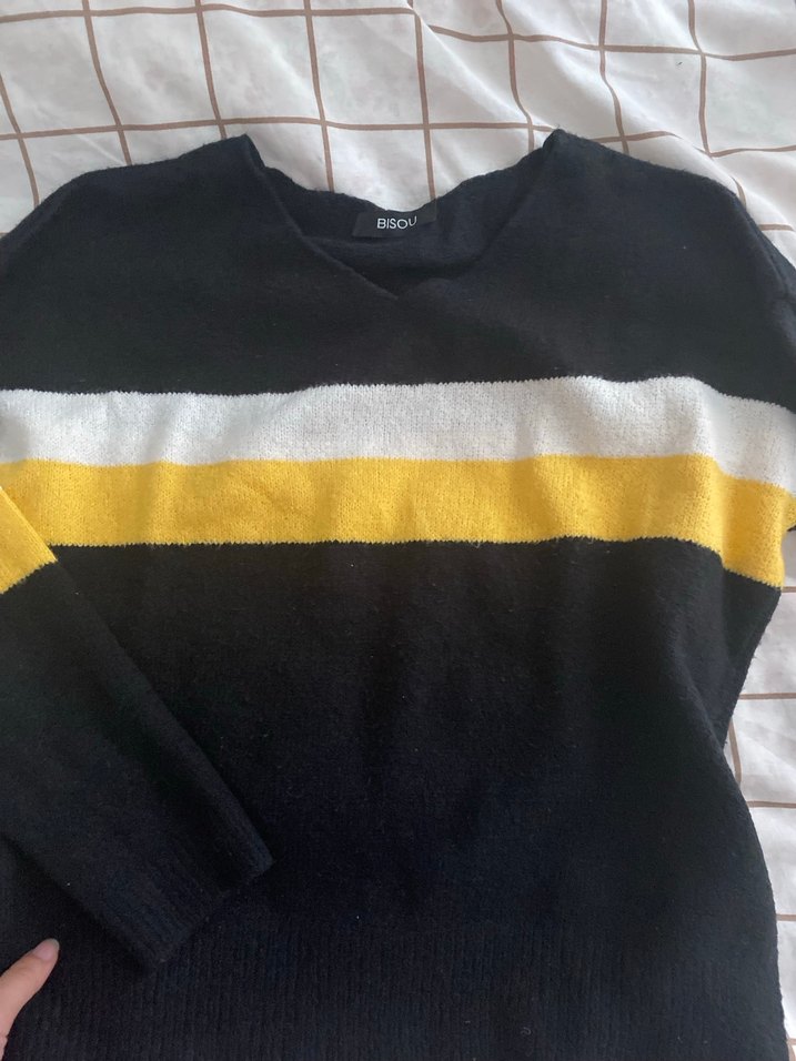 Örgü yün kumaştan, uzun kollu, yuvarlak yaka ve salaş kesim. Sarı, beyaz ve siyah çizgili, günlük sokak stili için uygun.