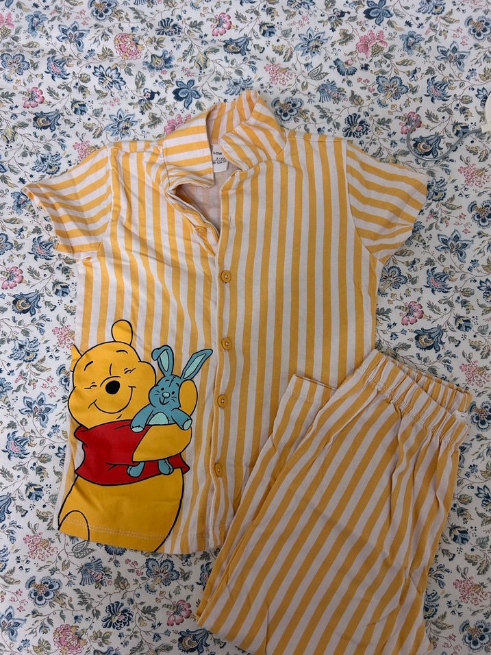 Sarı çizgili, kısa kollu pijama takımı. Üstte renkli Winnie the Pooh baskısı ve düğmeli kapanış