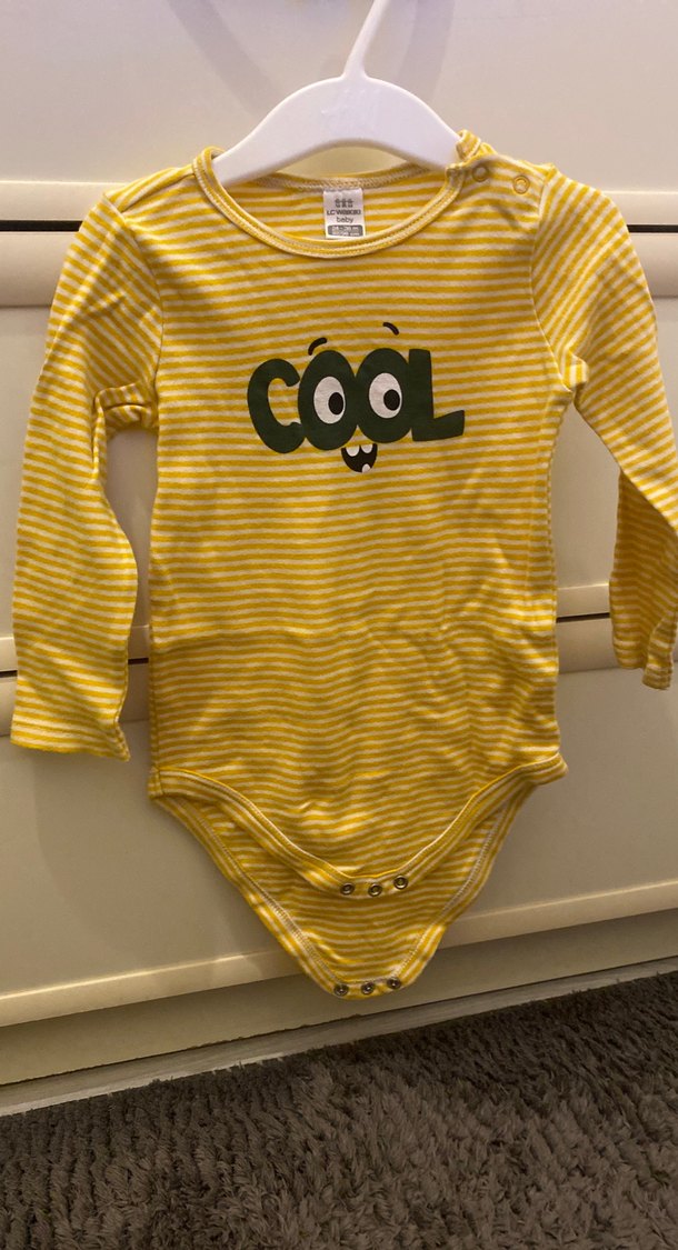 Yumuşak pamuktan, sarı çizgili uzun kollu bebek body. Bisiklet yaka ve eğlenceli "cool" baskılı, düğmeli ve örme dokulu.