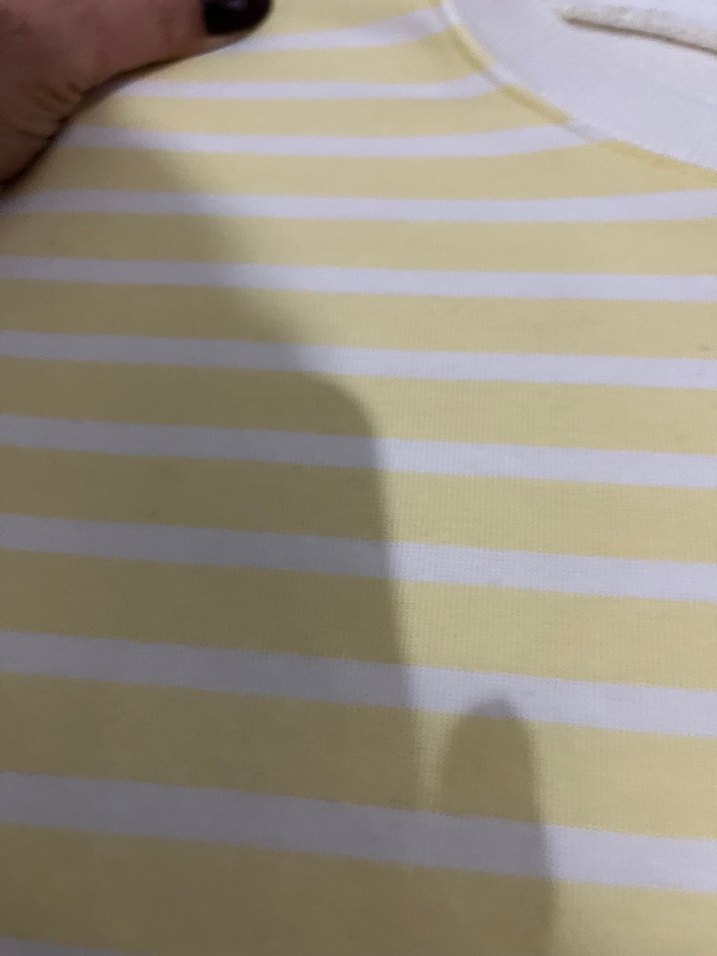Yumuşak pamuktan üretilmiş, açık sarı ve beyaz çizgili, vual yakalı, uzun kollu, çizgi detaylı, normal midi uzunlukta ve rahat kesim ince sweat
