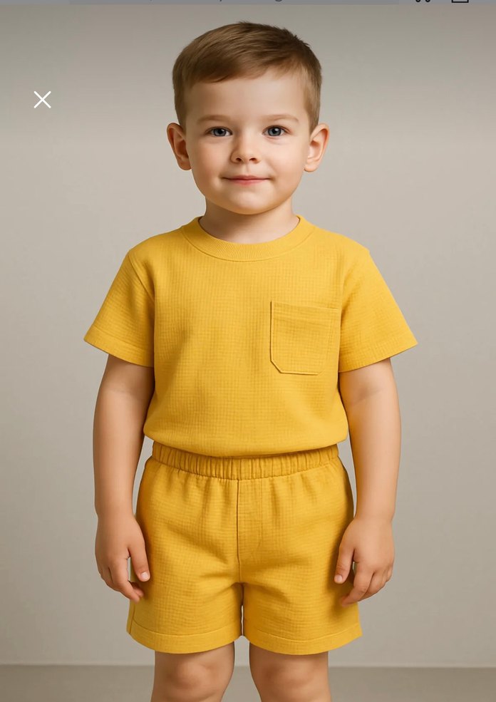 Yumuşak kumaştan, kısa kollu ve küçük göğüs cebine sahip açık sarı çocuk atlet.