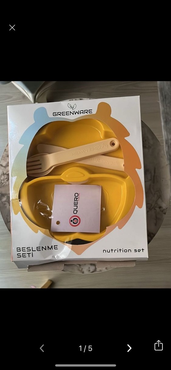 Sarı renkte çocuklar için beslenme seti, bölmeli tabak, çatal ve bıçaktan oluşur. Greenware markalıdır ve düzenli yemek sunar. ️