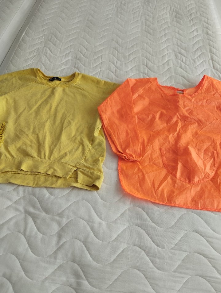 Sarı renkte, düz desenli Yumuşak kumaştan yapılmış, rahat ve sade tasarım. diğeri boyama önlüğü
