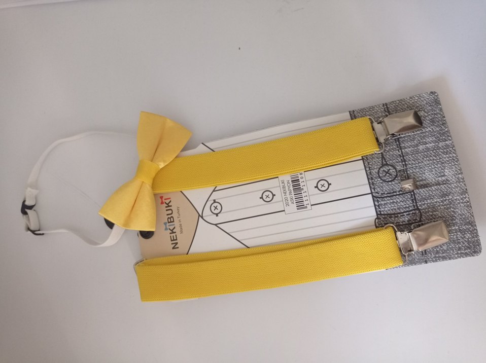 Sarı renkte, yumuşak sentetik kumaştan yapılmış çocuklar için fiyonklu kravat. Renkli baskılı şeritli, sade ve normcore tarzda.
