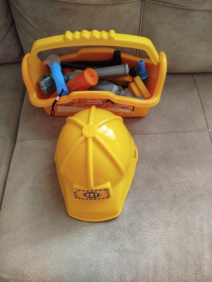 Canlı sarı renkte, çeşitli oyuncak aletler ve inşaat kaskı içeren eğitici oyuncak seti. ️