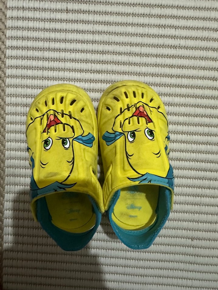 Sarı kaydırmaz terlikler, velcro bantlı ve renkli çizgi film desenli yumuşak kauçuk malzemeden üretilmiştir. Rahat ve günlük kullanım için uygundur.