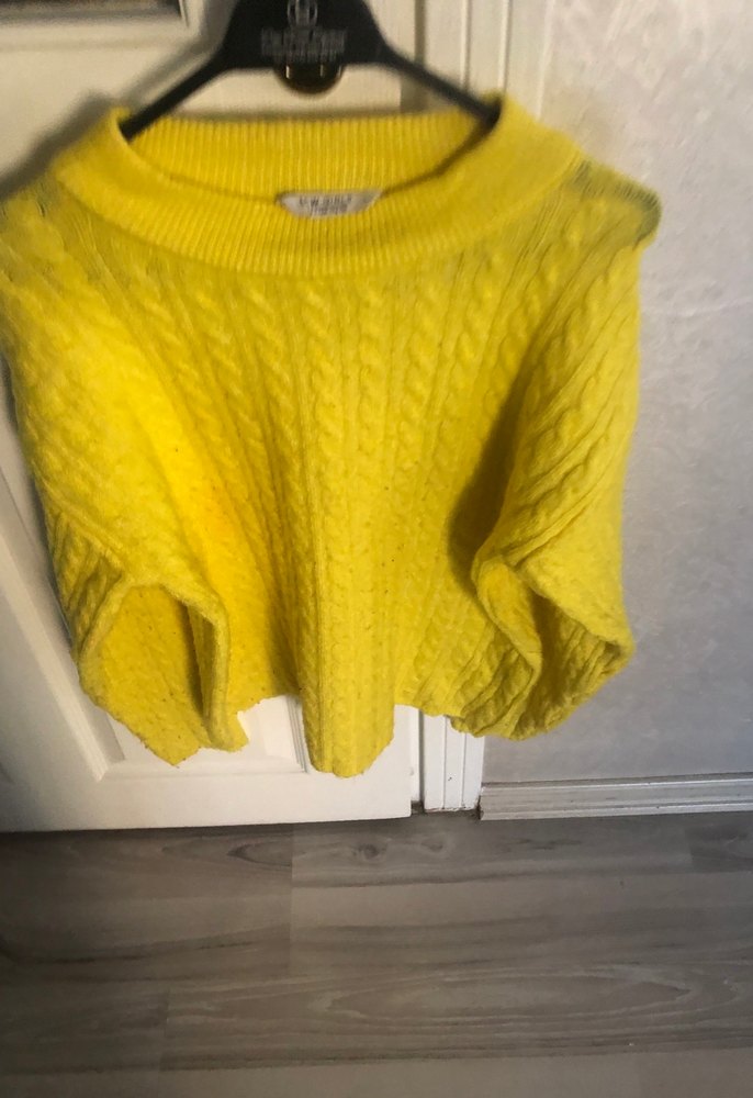 Sarı örgü kadın kazak, yuvarlak yaka ve uzun kolludur. Rahat kesim ve normal uzunlukta, yumuşak örme kumaştan yapılmıştır. Günlük kullanım için uygundur ve pastel tonlardadır.