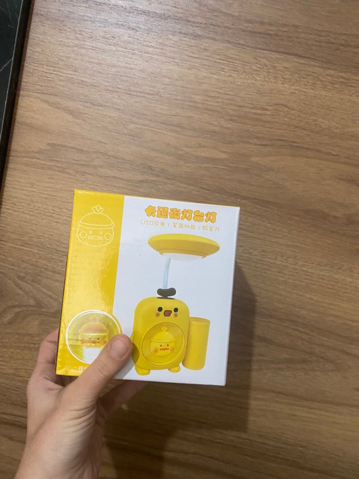 Sarı renkte çocuk masa lambası, sevimli tasarımlı ve küçük bir bardak tutucuya sahip. Çocuklar için yumuşak aydınlatma sağlar.