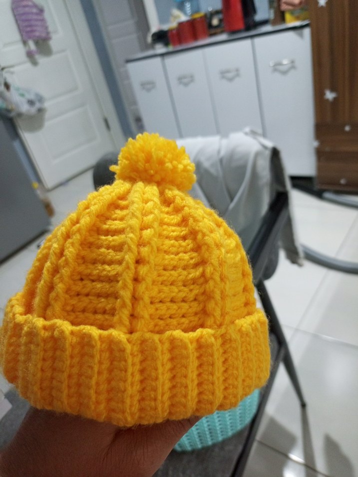 cocuklar için sarı renkte, yumuşak örgü iplikten yapılmış bere. Katlanabilir manşeti ve üstünde ponponu vardır, sokak stili için uygun. istediniz yaş ve modelde yapılır sipariş alınır