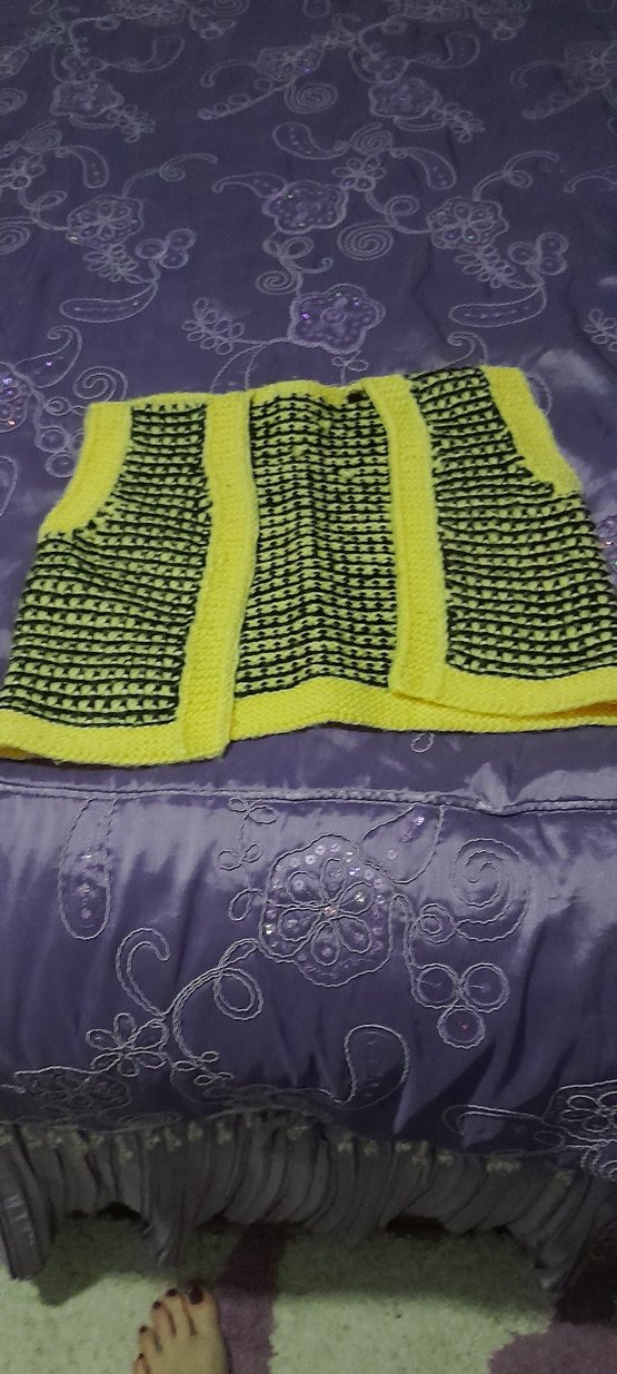 Çocuklar için yumuşak örgüden yapılmış, sarı ve siyah renklerde sıcak tutan yelek.