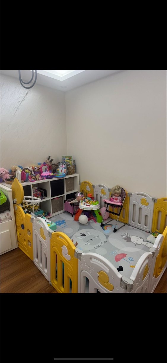 Açılır kapılı, sağlam yapılı sarı çocuk oyun parkı.