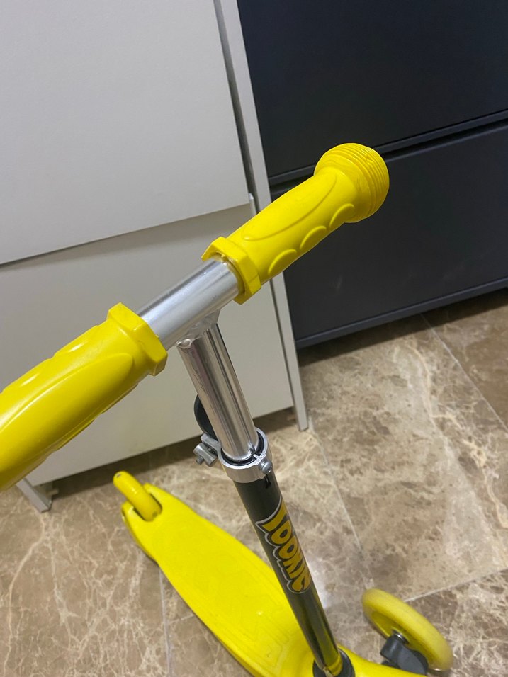 Bu çocuk scooter'ı parlak sarı renkte, rahat tutacaklara ve sağlam yapıya sahiptir. Yenidir, kızım pembe renk istediği için satıyorum.