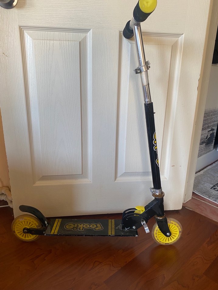 Sarı renkli çocuk scooter'ı, dayanıklı yapısı ve rahat çok kısa süre kullanıldı tutma yerleri ile konforlu sürüş sağlar. İyi durumdadır resimde gözüktüğü gibi