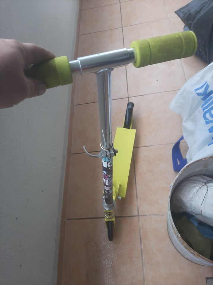 Sarı tabanlı, yeşil süngerli tutma yerlerine sahip renkli çocuk scooterı, hafif metal gövde ve ayarlanabilir yükseklik içerir.