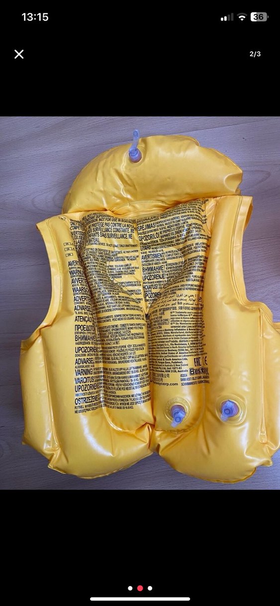Sarı çocuklar için şişme can yeleği, güvenli hava valfleri ve güvenlik uyarıları içerir. Havuz ve plajda kullanılabilir. ️