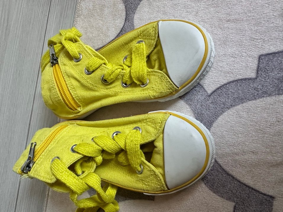 düz tabanlı sarı çocuk spor ayakkabılar. Renkli ve desensiz tasarımıyla günlük kullanıma uygun.