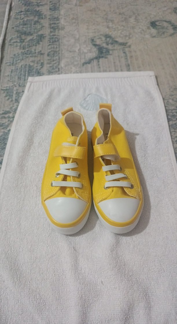Sarı renkli, kauçuk tabanlı çocuk spor ayakkabısı. Velcro bant ve bağcık detaylı, rahat ve şık sokak stili için uygun.