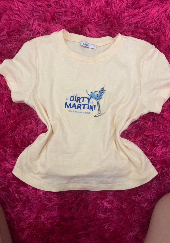 Pamuklu, kısa kollu, bisiklet yaka, sarı tişört. Pastel renkli 'Dirty Martini' baskısıyla sokak stili ve partiler için uygun.