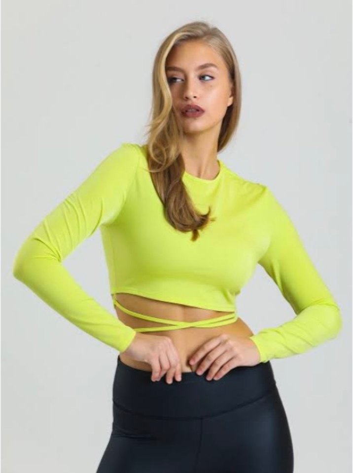 Sarı crop, uzun kollu, yuvarlak yakalı, sentetik kumaştan üretilmiş, sportif ve sokak stili için uygun şık kadın bluz.