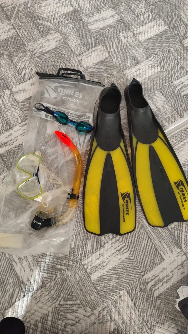 Sarı-siyah uyumlu dalış paletleri, maske, şnorkel ve renkli gözlüklerden oluşan dalış seti. Plajda kullanıma uygun kompakt tasarım. ️