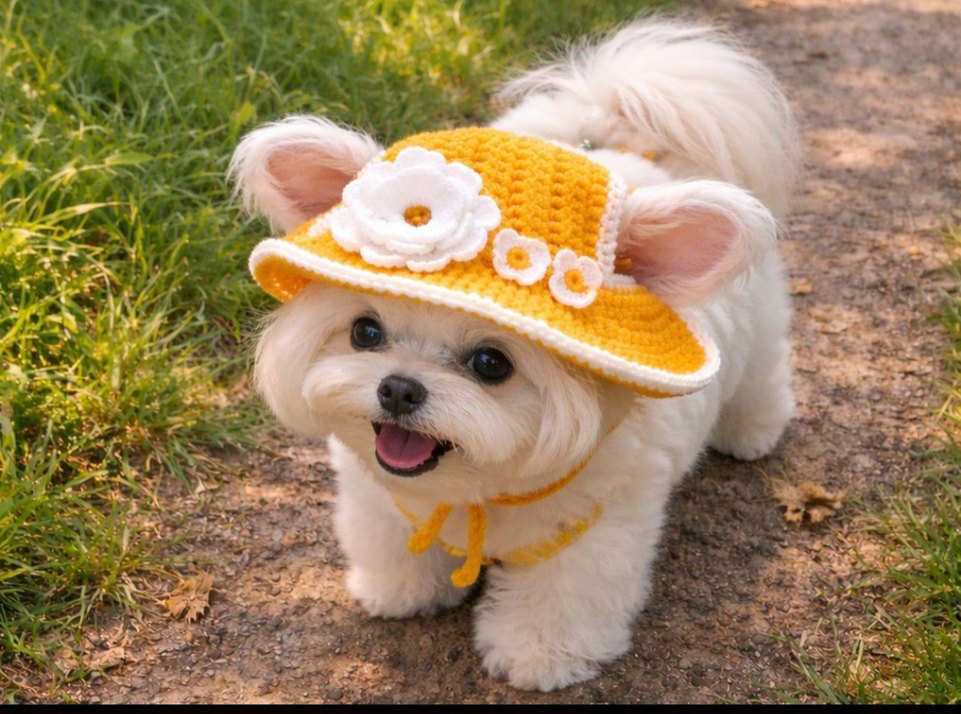 Sarı dantel detaylı, bohem stil nakışlı köpek kıyafeti. Yumuşak ve renkli çiçek işlemeleriyle süslenmiş.