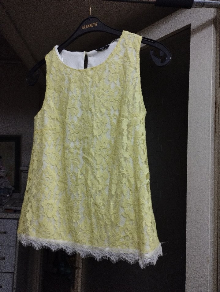 Sarı dantel bluz, yuvarlak yaka ve kolsuz, bol kesim bohem vintage tarzıyla günlük kullanıma uygundur.