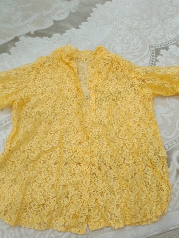 Sarı renkli, dantel detaylı, yarım kollu ve V yaka bohem tarzda kadın bluz. günlük kullanıma uygundur. alınan üründe iade yoktur
