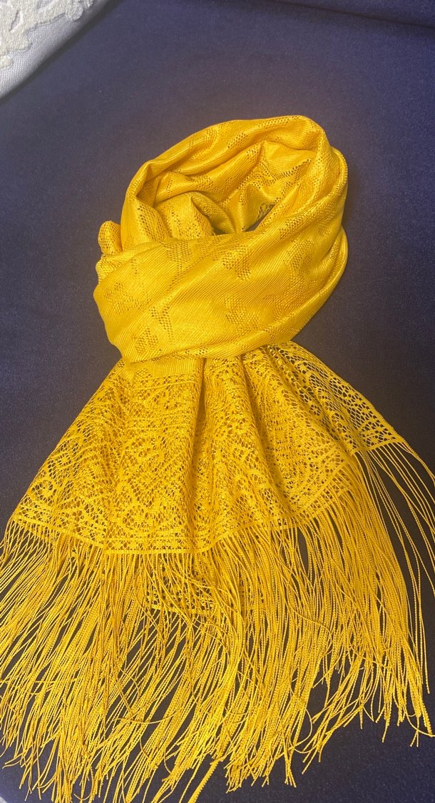 Kadınlar için ipeksi dokulu, canlı sarı renkte, dantel detaylı ve uzun püsküllü bohem tarzı şal.
