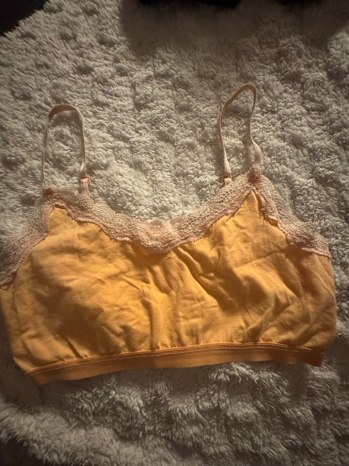 Pastel sarı renkte, kenarları dantel detaylı kadın bralet. İnce ayarlanabilir askıları ve rahat, orta uzunlukta kesimi vardır. Kumaşı yumuşak ve konforludur.