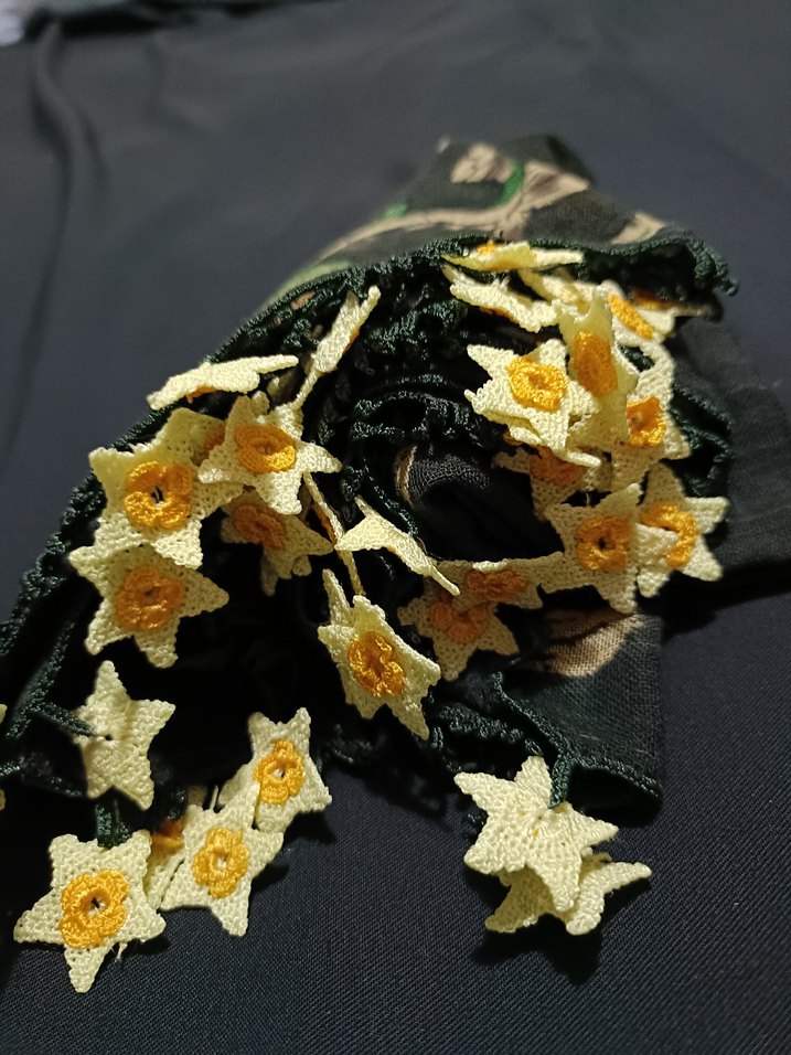 Koyu sarı renkte, dantel çiçek detaylı tekstil kadın şal, avangart tarzlar için uygun.
