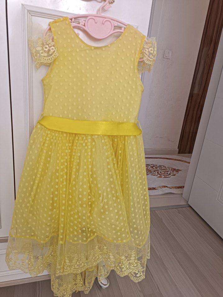 Sarı renkli, dantel detaylı kız çocuk elbisesi. Nakışlı desen, kısa kollu ve v yaka kesime sahip, modern klasik tarzda, vücuda oturan model. 9-10 yaş bir kez giyildi tertemiz