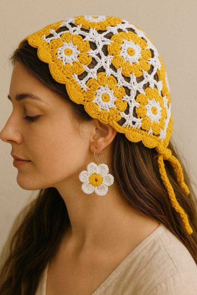 Çiçek desenli, sarı ve beyaz renkli dantel detaylı örgü bohem tarzda saç bandı, arkadan bağlamalı.