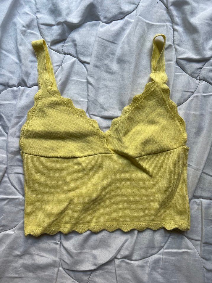 Fitted kesim, sarı keten kumaştan, V yaka ve dantel detaylı kolsuz kadın atlet. Pastel tonlarda, günlük kullanım için uygun.