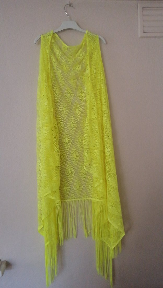 Sarı renkte, dökümlü, dantel püsküllü kadın pareo. Mayo bikini üstüne giyilen plaj giysisi