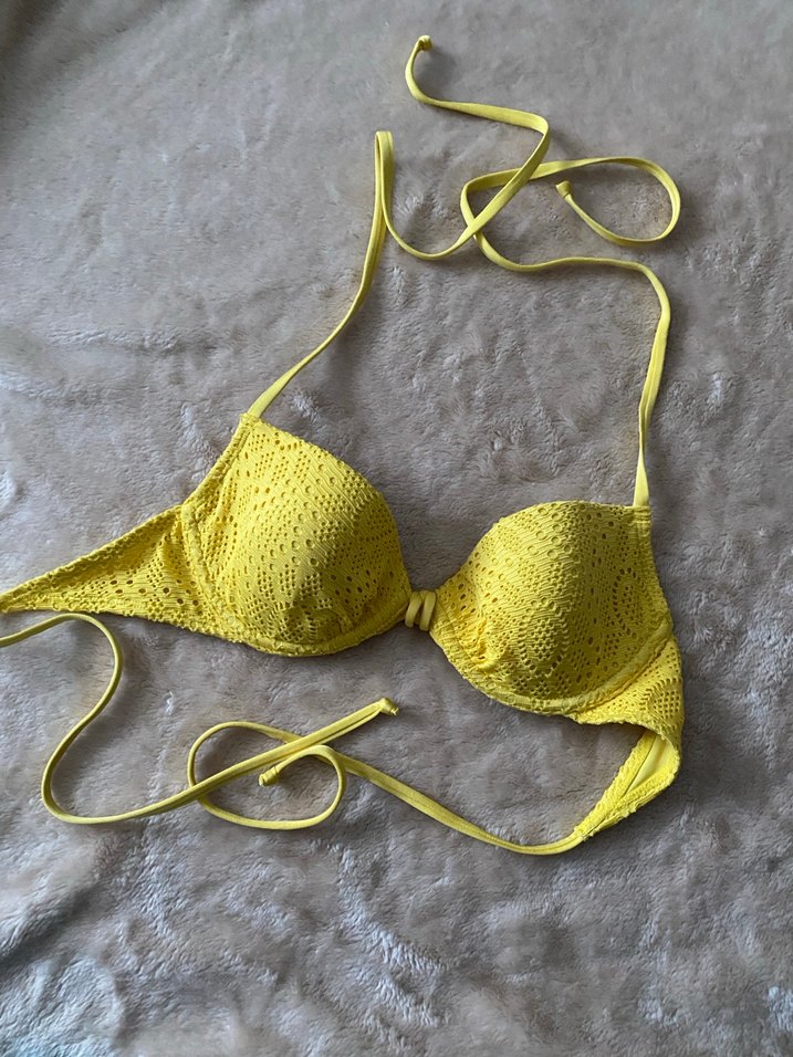 Sarı renkte, dantelli ve ip askılı, bohem tarzda, plaj için uygun, vücuda oturan bikini üstü.