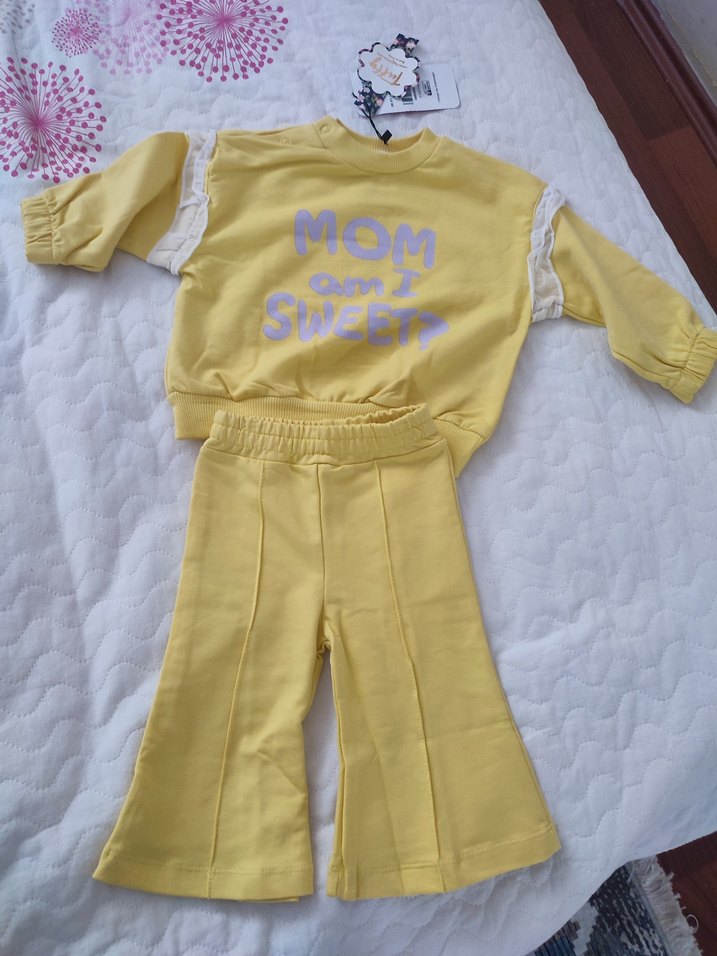 Pastel sarı renkte, dantelli uzun kollu ve "MOM am I SWEET" baskılı bebek kız takımı. Rahat, lastikli ve geniş paçalı pantolon ile tamamlanmıştır.