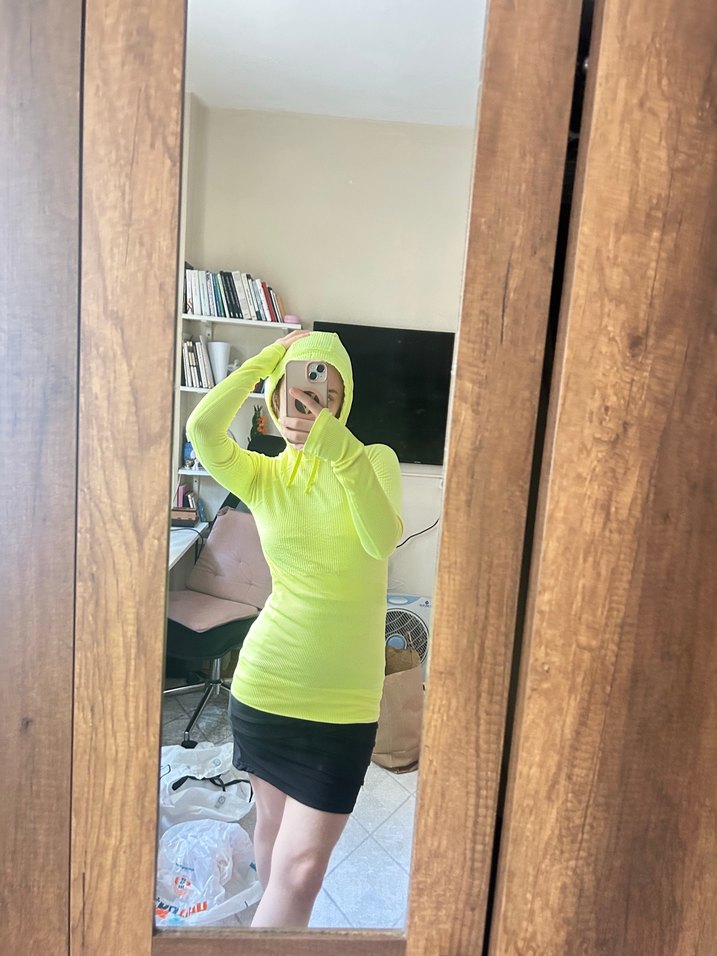 Dar kesim, uzun kollu midi elbise, boğazlı yaka ve hafif sarı renkte sentetik kumaştan, spor ve sokak stiline uygun. ♀️