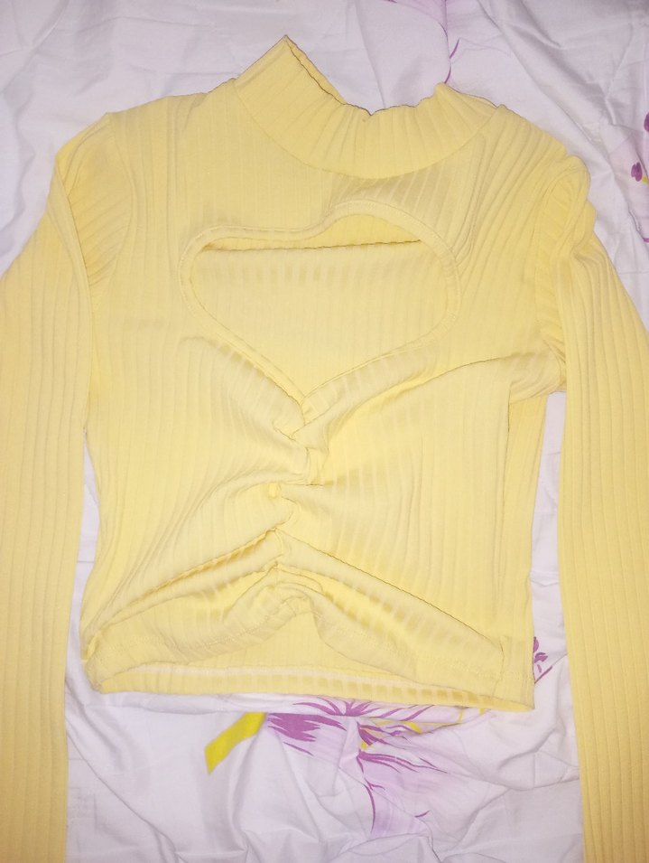 Sarı, uzun kollu, yüksek yakalı ve kısa boylu triko kazak. Göğüs kısmında kalp şeklinde kesik detayıyla trend sokak modasına uygun. HİÇ GİYMEDİM HEVESLE ALDIM GİYECEK YER BULAMADIM BERSHKA NIN DEKOLTESİ ÇOK BÜYÜK DEĞİL RAHATSIZ ETMEZ TAM CROP DA DEĞİL S VE M İÇİN DAHA İYİ OLACAKTIR