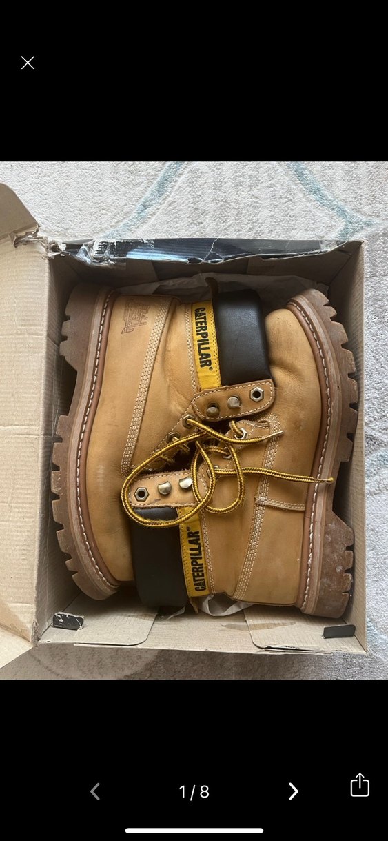 Sarı deri Caterpillar kadın botu, blok topuklu ve tokalı, sokak stili ve günlük kullanım için uygundur.