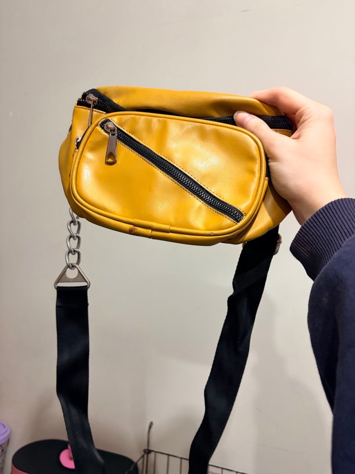 Sarı deri kadın bel çantası, kemerli tasarım ve çoklu fermuarlı bölmeler içerir, sokak tarzı ve günlük kullanım için idealdir. Fermuarı göründüğü gibi renk değişimi mevcuttur
