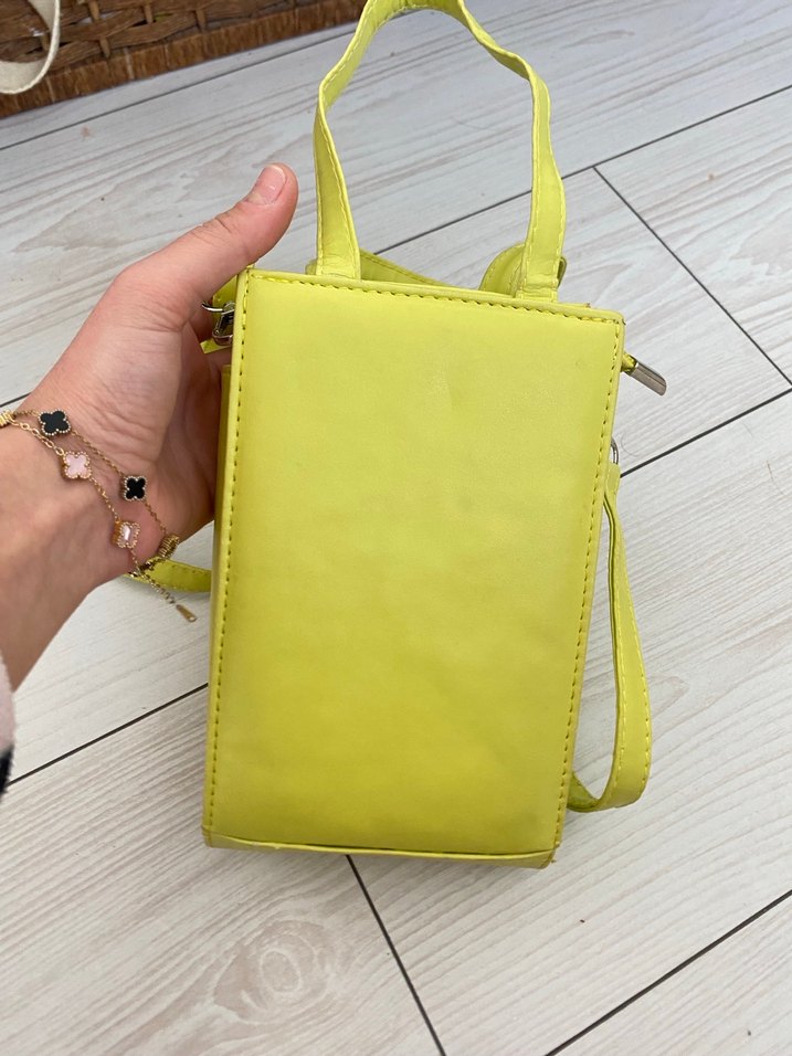 Sarı deri kadın çanta, fermuarlı ve minimalist çağdaş tasarıma sahiptir. Düz yüzeyli, renkli görünümüyle günlük kullanıma uygundur.