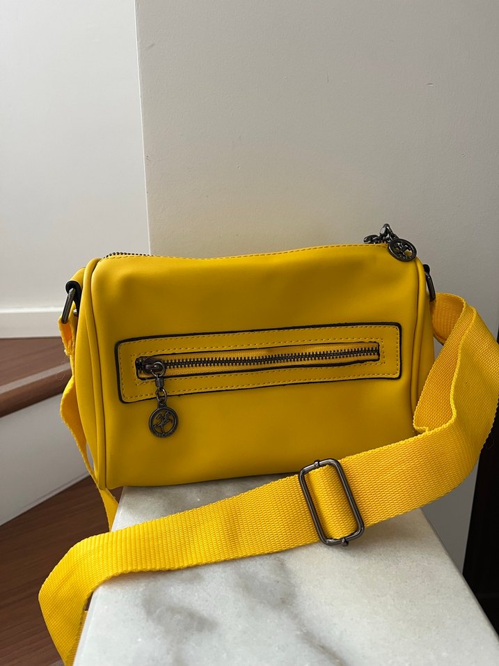 Sarı deri, ön ve iç fermuarlı cep bulunan kadın çantası. Minimalist tarz, günlük kullanıma uygun. Tertemizdir.