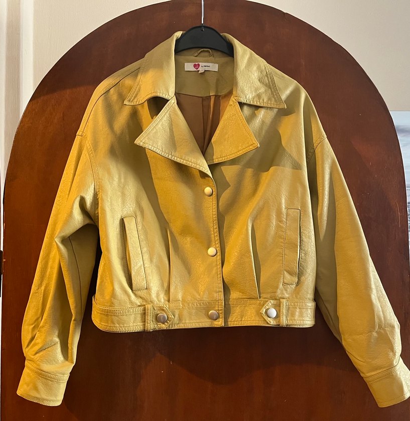sarı deri ceket, düğmeli ve geniş yakalıdır. Uzun kollu, bol kesim ve midi boyda, gündelik şık sokak stili için uygundur.