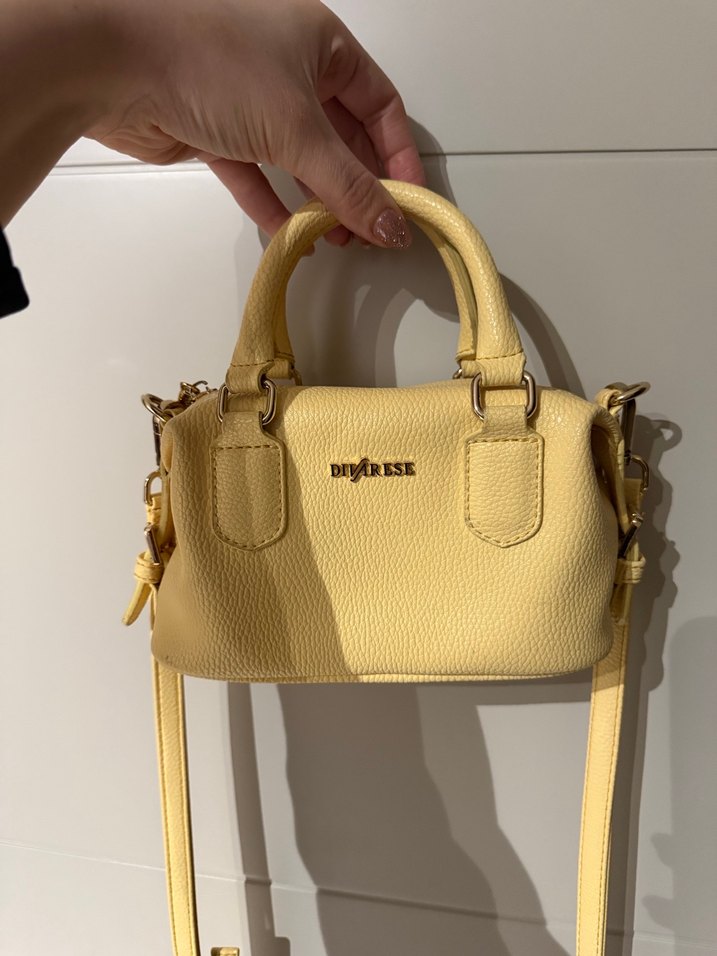 Pastel sarı renkte deri el çantası, minimal tasarım ve tokalı detaylara sahip. DIVARESE logosu bulunur, günlük kullanım için uygundur. Sayılı temiz kullanılmıştır .sorunsuzdur .